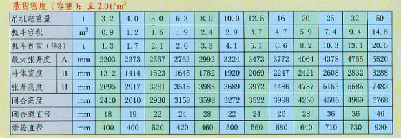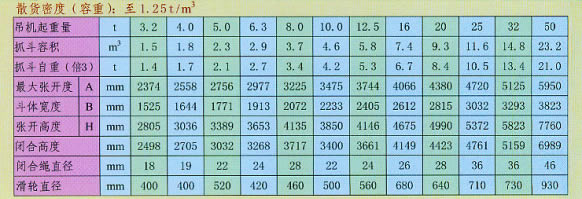 双索双瓣抓斗抓取比重为0.4-3.2t/m3各种粒度均匀的散货,通常为粮食、煤炭、水泥、黄砂石子、矿粉、矿石、盐等。抓斗容积有0.5至10立方。