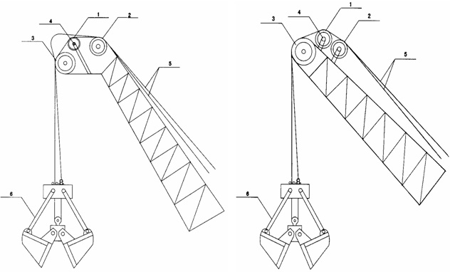1、称重滑轮2、过桥滑轮3、吊臂滑轮4、测力传感器5、提升、开闭绳6、无功抓斗